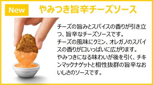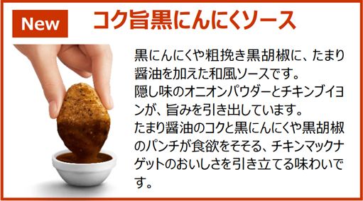 そして、チキンマックナゲットの味わいをよりお楽しみいただける期間限定ソース2種も新たに登場します。「コク旨黒にんにくソース」はたまり醬油のコクと黒にんにくや粗挽き黒胡椒のパンチが食欲をそそる、チキンマックナゲットのおいしさを引き立てる味わいです。また、「やみつき旨辛チーズソース」は、チーズのうまみとスパイスの香りが引き立つチーズソースでやみつきになる味わいが後を引く、チキンマックナゲットと相性抜群の旨辛なおいしさのソースです。ぜひこの機会に「スパイシーチキンマックナゲット 黒胡椒ガーリック」や「チキンマックナゲット」とともにお楽しみください。