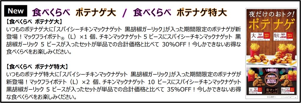 さらに、今しかできないお得な食べくらべセットとして、夕方5時からの夜マック限定の人気商品「ポテナゲ」に「スパイシーチキンマックナゲット 黒胡椒ガーリック」が入った「食べくらべ ポテナゲ大」と「食べくらべ ポテナゲ特大」が1月18日(水)から期間限定で登場いたします。2つの新ソースも楽しめるポテナゲを、この機会にぜひ味わっていただければと思います。