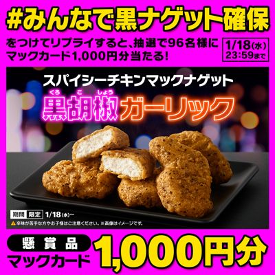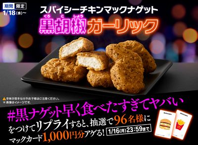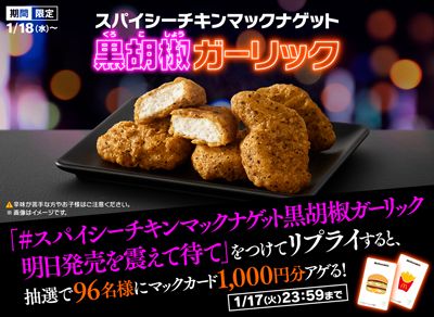 日本マクドナルド株式会社(本社:東京都新宿区、代表取締役社長兼CEO:日色 保)は、粗挽きブラックペッパーとガーリックの旨みが後引くおいしさの、「スパイシーチキンマックナゲット 黒胡椒ガーリック」を1月18日(水)から期間限定で全国のマクドナルド店舗にて販売いたします。さらに、「スパイシーチキンマックナゲット 黒胡椒ガーリック」のおいしさをより引き立たせる、2種の新ソース「コク旨黒にんにくソース」と「やみつき旨辛チーズソース」が期間限定で登場するほか、夕方5時からの夜マック®時間帯では「スパイシーチキンマックナゲット 黒胡椒ガーリック」もお楽しみいただける「食べくらべ ポテナゲ大」「食べくらべ ポテナゲ特大」を期間限定で販売いたします。