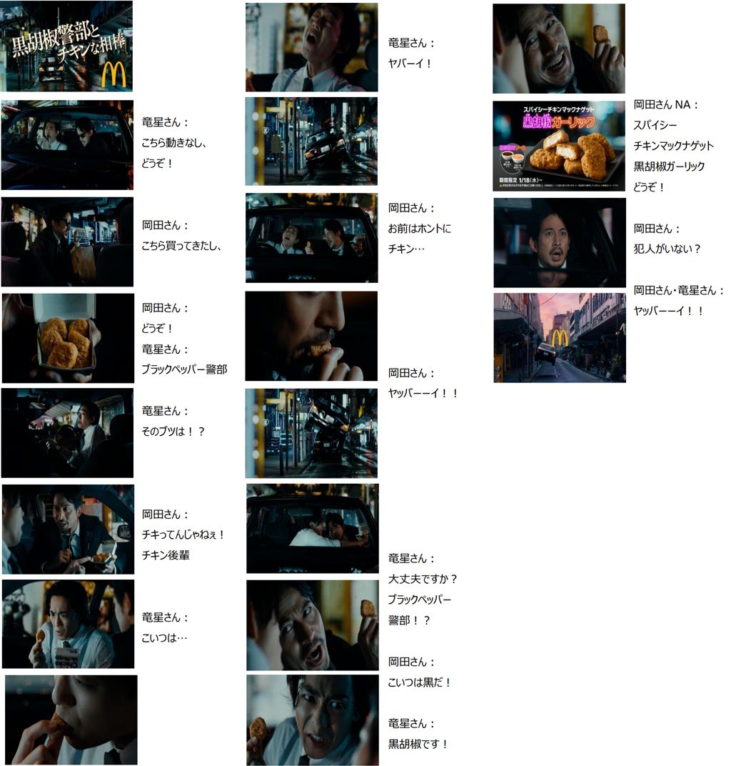 1月17日(火)から放映の新TVCMでは、俳優の岡田准一さんと竜星涼さんが「ブラックペッパー警部とチキンな相棒」という名(!?)コンビを演じます。「スパイシーチキンマックナゲット 黒胡椒ガーリック」を“これは黒だ・・!”と追い詰めるお二人の会話劇が見どころです。さらにTwitterキャンペーンなど各種施策もご用意しておりますので、あわせてお楽しみください(詳細は下記を参照)。
