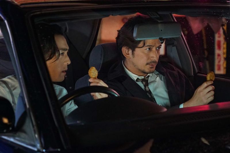「ブラックペッパー警部」役の岡田さんと「チキンな相棒」役の竜星さん、2人で張り込む車内が舞台となる撮影は、大型LEDディスプレイを備えたスタジオで行われました。背景にはネオンや通行人など、実在する繁華街の景色が車を包み込むように映し出され、岡田さんも竜星さんも臨場感に満ちたバーチャル撮影用のセットに興味津々。本物の刑事を思わせるシリアスな表情で車に乗り込んだ2人ですが、車体を揺らすテストでは「めっちゃ揺れる~(笑)」と遊園地で遊ぶ子どものように笑顔を見せていました。