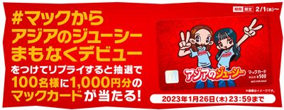 さらに、西野七瀬さん・飯豊まりえさんが期間限定のデュオ・アジアのジューシーとして、90年代にヒットした名曲『アジアの純真』ならぬ『アジアのジューシー』を歌い上げます。1月26日(木)からは、ミュージックビデオ(MV)が公開されるほか、1月31日(火)より新TVCMを放映いたします。さらにレコーディング風景や食レポ・オフショット・CDジャケット風の画像など、仲良しデュオ・アジアのジューシーのさまざまなコンテンツをご用意しました。また、マクドナルド公式Twitterで商品発売までのカウントダウン動画を公開するなど各種施策も多数ご用意しておりますので、あわせてお楽しみください。(詳細は下記を参照)