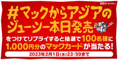 日本マクドナルド株式会社(本社:東京都新宿区、代表取締役社長兼CEO:日色 保)は、アジアの味わいが楽しめるバーガー3種が一挙に新登場するマクドナルド初のアジアンフェア“アジアのジューシー”として、「担々ダブルビーフ」「油淋鶏チキン」「スイートチリシュリンプ」のアジアンバーガーズを、2月1日(水)より期間限定で全国のマクドナルド店舗にて販売いたします。