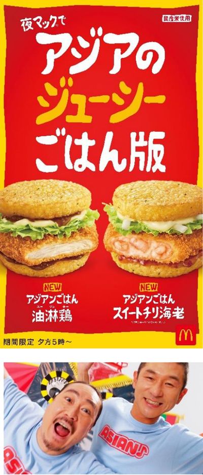 日本マクドナルド株式会社(本社:東京都新宿区、代表取締役社長兼CEO:日色 保)では、アジアの味わいが楽しめるマクドナルド初のアジアンフェア“アジアのジューシー”を2月1日(水)より開催しております。2月8日(水)からはさらにこのアジアの味わいをごはんバーガーとしてもお楽しみいただくため、新商品の「アジアンごはん 油淋鶏」「アジアンごはん スイートチリ海老」の2種のごはんバーガーを、夕方5時からの夜マックのメニューとして期間限定で全国のマクドナルド店舗にて販売いたします。