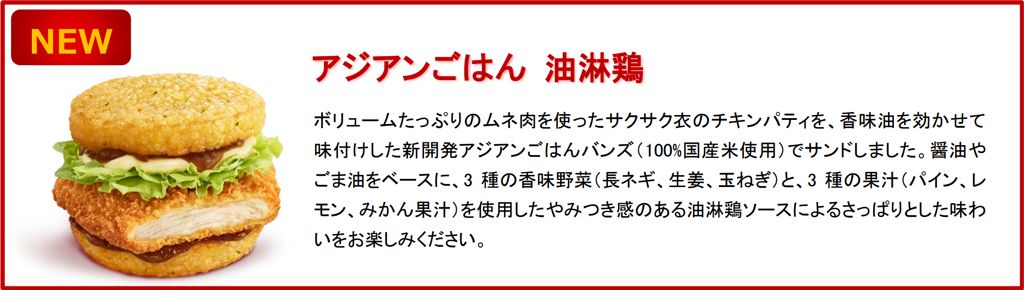 そして、2月8日(水)からは、夕方5時からの「夜マック」限定で、このアジアの味わいをごはんバーガー史上初の特製のアジアンごはんバンズでサンドした「ごはんバーガー」でもお楽しみいただけます。