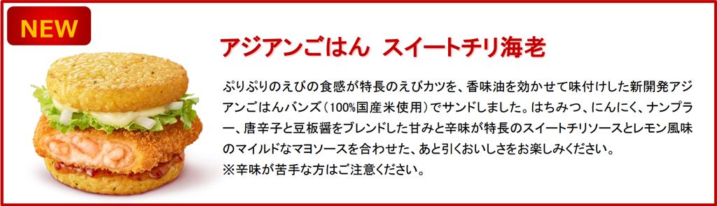 「アジアンごはん 油淋鶏」は、ボリュームたっぷりなチキンパティと油淋鶏ソースを新開発のアジアンごはんバンズでサンドした、醤油やごま油をベースに3種の香味野菜と3種の果汁を使用した油淋鶏ソースがやみつきになる一品です。「アジアンごはん スイートチリ海老」は、ぷりぷり食感のえびカツとスイートチリソースを新開発のアジアンごはんバンズでサンドした、はちみつ、にんにく、ナンプラー、唐辛子と豆板醤をブレンドした甘みと辛味が特長のスイートチリソースとレモン風味のマイルドなマヨソースを合わせた絶妙な味わいの商品です。どちらも、香味油を効かせてアジア風に新開発した100%国産米使用のアジアンごはんバンズとの相性が抜群な味わいとなっております。