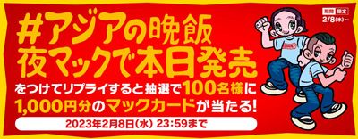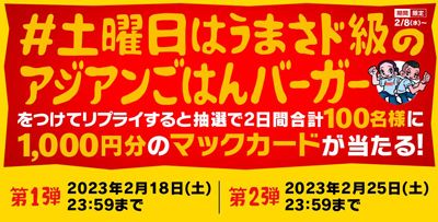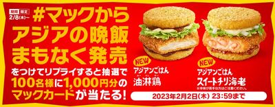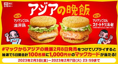 さらに、笑い飯のお二人を起用した新TVCM「アジアの晩飯」篇を2月7日(火)より放映開始いたします。アジアのジューシーのごはん版として、『アジアの純真』ならぬ『アジアの晩飯』を歌い上げる本作と合わせ、先行して放映しているバーガー版TVCM『アジアのジューシー篇』との違いにご注目ください。また、マックカードが当たるTwitterキャンペーンもご用意しておりますので、あわせてお楽しみください。(詳細は下記を参照)