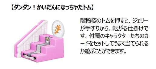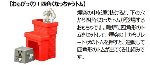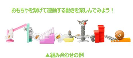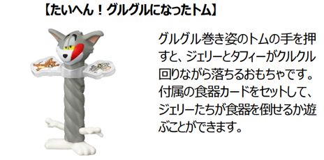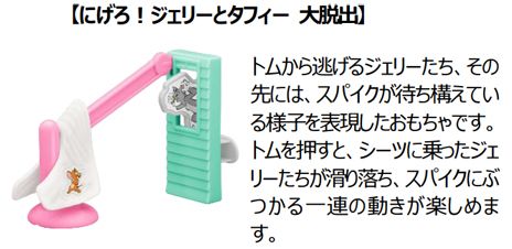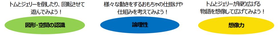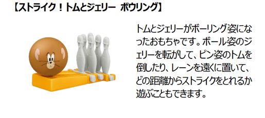 世界中で愛されるワーナー・ブラザースのアニメ「トムとジェリー」のドタバタ劇を表現したおもちゃがハッピーセットに登場します。今回、2月10日(金)のトムとジェリーの誕生日を記念してコラボレーションが実現しました。ボール姿のジェリーを転がしてピンを倒したり、トムの尻尾や手を押すとジェリー等がころころ回転したり、様々な動きが楽しめる仕掛けつきのおもちゃ全6種です。今回のおもちゃは、図形・空間の認識と論理性の理解を深め、物語を考える想像力を育みます。トムやジェリーが回転したり、倒れたりするなど、様々な動きを見せる仕掛けは、遊びながら「立体図形」への関心を高めます。また、「どこを押せば、トムやジェリーが動くのか?」と因果関係に注目すれば、「論理」的思考の遊びへと発展します。おもちゃを繋げれば、トムやジェリーが繰り広げる世界を「想像」し、物語を作る遊びも楽しめます。