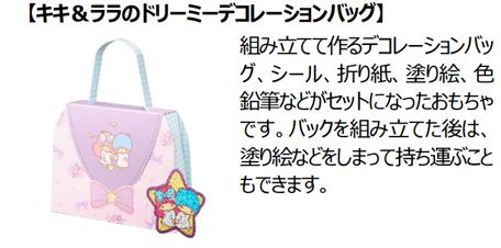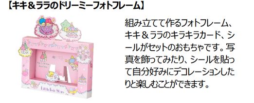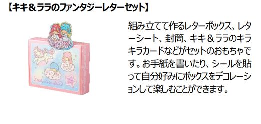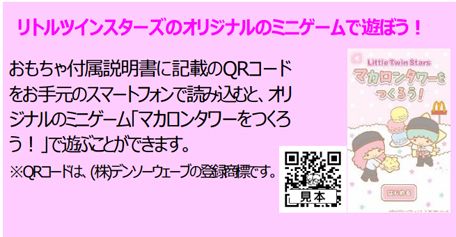 株式会社サンリオのキャラクター「リトルツインスターズ(キキ&ララ)」とのコラボレーションが実現したハッピーセット「リトルツインスターズ」は、パステルカラーを基調にキキ&ララのかわいい世界感がつまった文具のおもちゃです。小物入れ、レターボックス、バッグなど組み立てて作る6種のおもちゃにそれぞれキキ&ララのカード、シールなどがついています。組み立てたり、デコレーションしたり、お手紙を書いたり色々な遊びが楽しめます。今回のおもちゃは、図形・空間の認識や表現力を高める遊びが楽しめ、社会性・感情も育みます。小物入れや、バッグを組み立てる作業は、「図形・空間」をよく見て立体を作る遊びです。自分好みにシールを貼ってデコレーションする遊びは、デザインをする「表現力」を育みます。また、お手紙を書いて、友達とのやりとり(社会性・感情)を楽しむなど、キキ&ララと一緒にバリエーション豊かな遊びをお楽しみいただけます。今回、おもちゃ付属説明書に記載のQRコードをお手元のスマートフォンで読み込むと、オリジナルのミニゲーム「マカロンタワーをつくろう!」で遊ぶことができます。ぜひ親子でも一緒にお楽しみください。