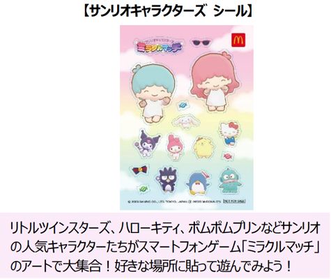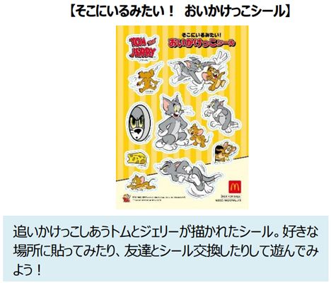 2⽉11⽇(⼟)・12⽇(⽇)の2⽇間は、ハッピーセット「トムとジェリー」を1セットご購⼊につき「そこにいるみたい! おいかけっこシール」を、ハッピーセット「リトルツインスターズ」を1セットご購⼊につき人気スマートフォンゲーム「ミラクルマッチ」とコラボレーションした「サンリオキャラクターズ シール」をプレゼントいたします。