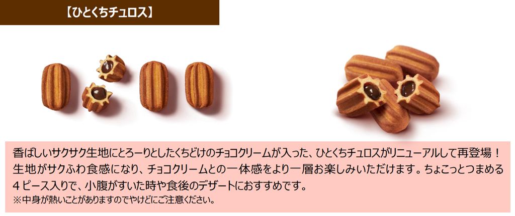 「ひとくちチュロス」は、香ばしいサクサク生地にとろーりとしたくちどけのチョコクリームが入ったホットスイーツで、2022年2月に初登場し、味わいもさることながら、コロコロとしたふっくら可愛らしいフォルムと食べやすいサイズ感も、大変ご好評いただきました。今回は、生地の食感をサクふわ生地にリニューアル。チョコクリームとの一体感をより一層お楽しみいただけるようになりました。生地には、昨年に引き続き隠し味にキャラメルパウダーを加え、ほんのり香ばしさを感じていただけます。