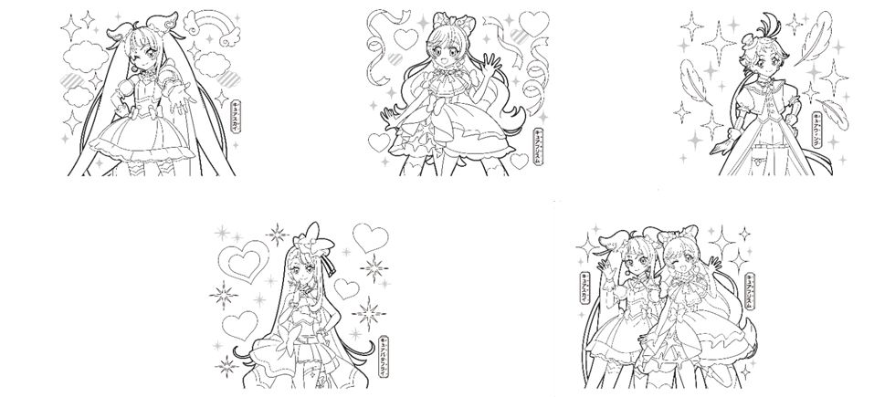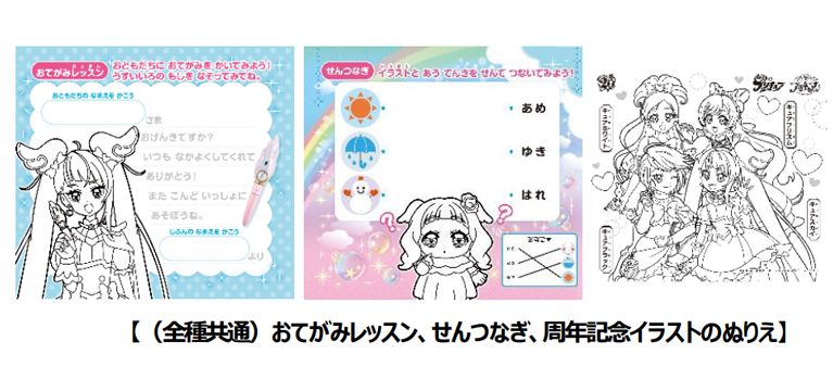 今年20周年目を迎えるプリキュア最新シリーズ「ひろがるスカイ!プリキュア」のキャラクターたちが登場する全5種のぬりえブックです。“キュアスカイ”などを始めとする、これからテレビで大活躍間違いなしのキャラクターたちが登場するぬりえページに加えて、お手紙や、イラストと言葉を繋ぎあわせる遊びを楽しめるページも付いています。