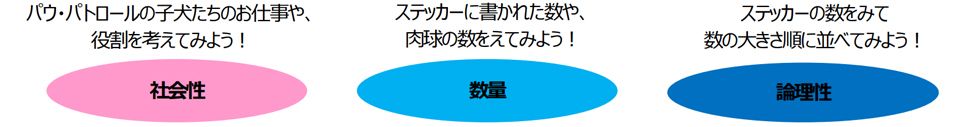 パウ・パトロールのキャラクターたちは、元気に活き活きと、人を助ける仕事をしています。警察の仕事、消防の仕事などが、社会的にどんな役割を果たしているのかを、キャラクターのカードの解説をみながらお話ししましょう。お風呂でくつろぐ親子の時間に、書かれた数字を読み、1から8まで数えてみたり、「1と8を合わせるといくつになるか?」を、肉球のマークを数えて個数を確認したりして、数の話題を楽しみましょう。日常の中で数を考える機会はたくさんあります。きょうは何日で、どんな数に出会ったかを、お風呂でお話ししましょう。