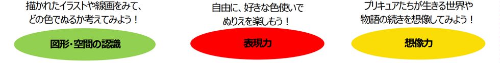 プリキュアのキャラクターが大好きな子どもは、頭の中で、ファッショナブルなキャラクターを動かして楽しんでいます。ファンタジーの想像を、ぬりえを完成させながら、おうちの方やお友達へ伝える遊びをしてみましょう。モノクロの線画を見て、図形全体のデザインを想像して、部分の色を決めてゆくことは、ファンタジーの世界を人へ伝える表現作業といえるのです。出来上がった絵を話題にしながら、お手紙を交換し、コミュニケーションを楽しむ「やりとり遊び」も、家族で楽しみましょう。