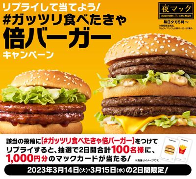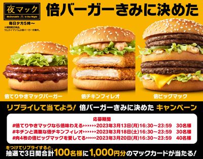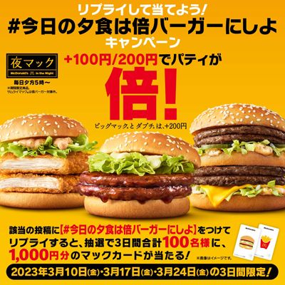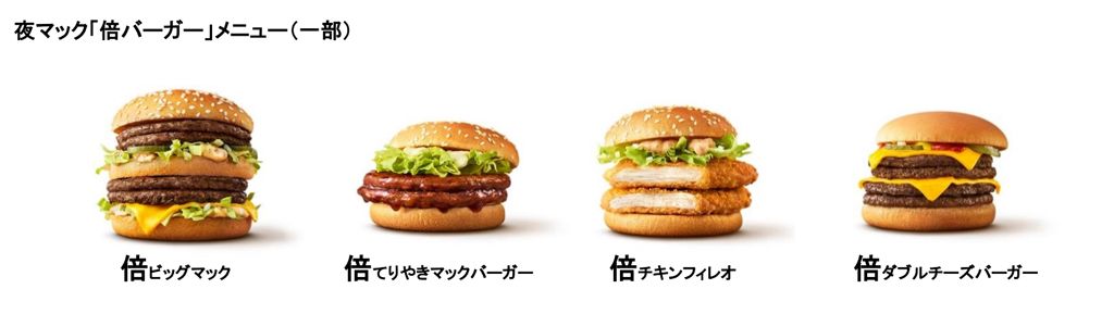 「夜マック」は、しっかりとお食事をとりたいというニーズがあるディナー時間帯でもご満足いただけるボリューム感とおいしさをご提供するため、2018年3月より、毎日夕方5時からのディナー時間帯限定でご提供しているメニューです。「倍バーガー」は、レギュラーメニューのバーガー(※サムライマック®と期間限定商品を除く)を対象に、+100円/200円(税込)していただくことでパティが倍になるメニューです。今年で販売開始から5周年を迎え、累計販売食数は1億食を突破※しており、満足感あるディナーとしてご好評いただいております。(※2018年3月19日~2022年12月31日までの期間の倍バーガーのご注文数から算出)