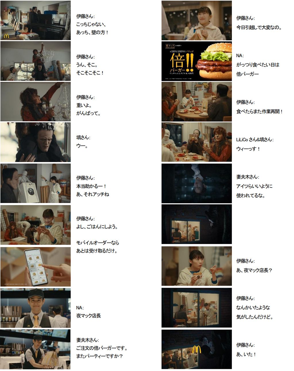 新TVCMでは、「倍バーガー」を持ち帰った伊藤さんの様子を夜マック店長の妻夫木さんがこっそり見に行くと、仲間たち(オオカミ女役のLiLiCoさんやフランケンシュタイン役の塙さん)が伊藤さんの指示どおりにテキパキと引越しのお手伝いをしている姿を目の当たりにしてしまう、というユニークな展開になっています。また、新TVCMの放映に合わせ、マックカードが当たるTwitterキャンペーンもご用意しておりますので、あわせてお楽しみください。(詳細は下記を参照)。