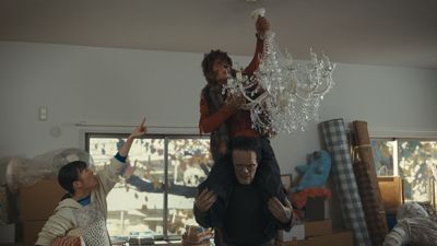 引越しでヒカリ役・伊藤さんに家具の移動を指示されるシーンでは、フランケンシュタインの塙さんがオオカミ女のLiLiCoさんを肩車してシャンデリアを設置。意外と重さのあるシャンデリアに手こずるLiLiCoさんでしたが、肩車をしてバランスを取る塙さんも同じくらい苦戦。よろけてバランスを崩しそうになる塙さんにLiLiCoさんが「代わりましょうか?」と声を掛け、現場を和ませるシーンも。CM内のLiLiCoさんや塙さんの「ウー。」という声は、引越し作業の大変さが伝わる真に迫った演技になっています。