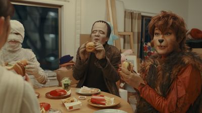 引越しがテーマの今回の撮影。フランケンシュタインやオオカミ女などの姿に扮しながらもさらに家具の重さや肩車など、出演者の皆さんにとっては肉体的な負担も大きい撮影でした。そんな出演メンバーたちが笑顔になれたのが倍バーガーを食べるシーン。肉体労働のあとの“おなかがすいた日”は、まさに倍バーガーを食べて英気を養うのにピッタリで、塙さんもLiLiCoさんも笑顔で倍バーガーを頬張りました。食べて作業再開を急かす伊藤さんの掛け声に対し“引越し要員”メンバーが返答する「うぃーっす」も、倍バーガーの満足感からか明るいトーンや楽しい感じの声色など、さまざまなバリエーションが見られました。