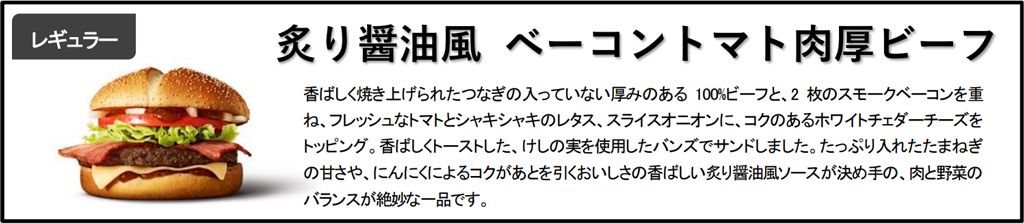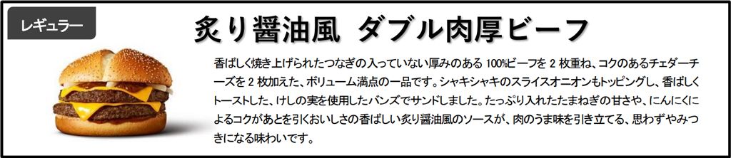 | 炙り醤油風 ダブル肉厚ビーフ | 550円~ | 850円~ | レギュラー販売中 | 午前10:30~閉店まで (24時間営業店舗では翌午前4:59まで) |