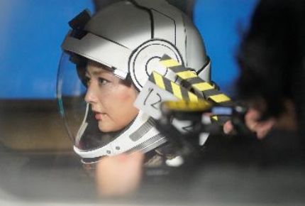 直径5mほどの大きさの小惑星がコックピットの脇をかすめるシーンでは、ワイヤーを使って10人がかりで釣り上げた小道具の隕石を、高所から一気にコックピット目がけて落下させるというスピード感あふれる演出が施されています。小道具とはいえ、巨大な隕石が轟音とともにものすごいスピードで落ちてくる様子に、「すごいですね!」と目を丸くしていた常盤さん。制作チーム一同、可能な限りCGや合成に頼らない方法でリアルな質感が垣間見える映像を模索した、臨場感たっぷりのシーンは必見です。