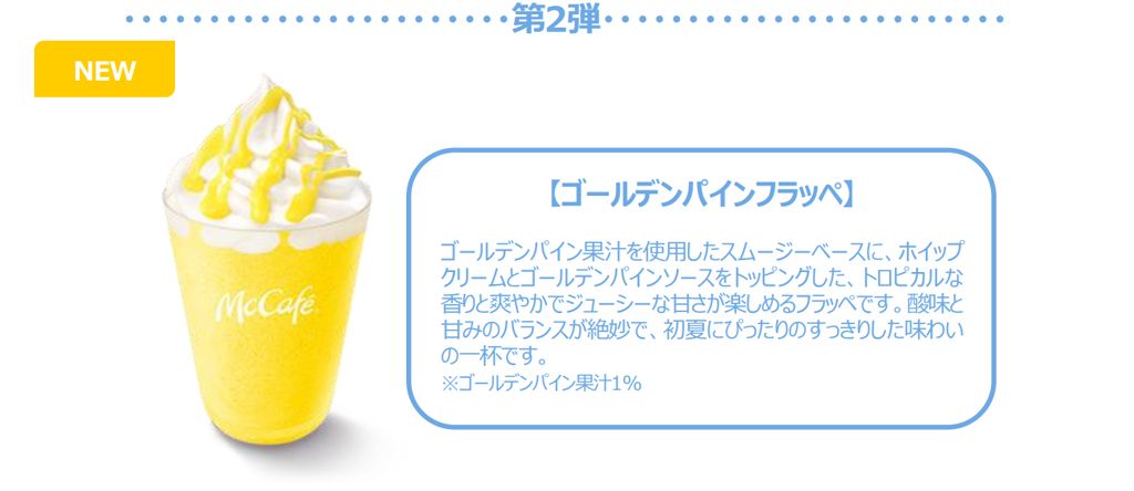 日本マクドナルド株式会社(本社:東京都新宿区、代表取締役社長兼CEO:日色 保)は、専任バリスタが「本格カフェコーヒー」を提供するコーナー“McCafé by Barista®”(マックカフェ バイ バリスタ)併設店舗および一部マクドナルド店舗にて、ごろっとももシリーズ第2弾として、「ゴールデンパインフラッペ」を5月24日(水)より期間限定で販売いたします。