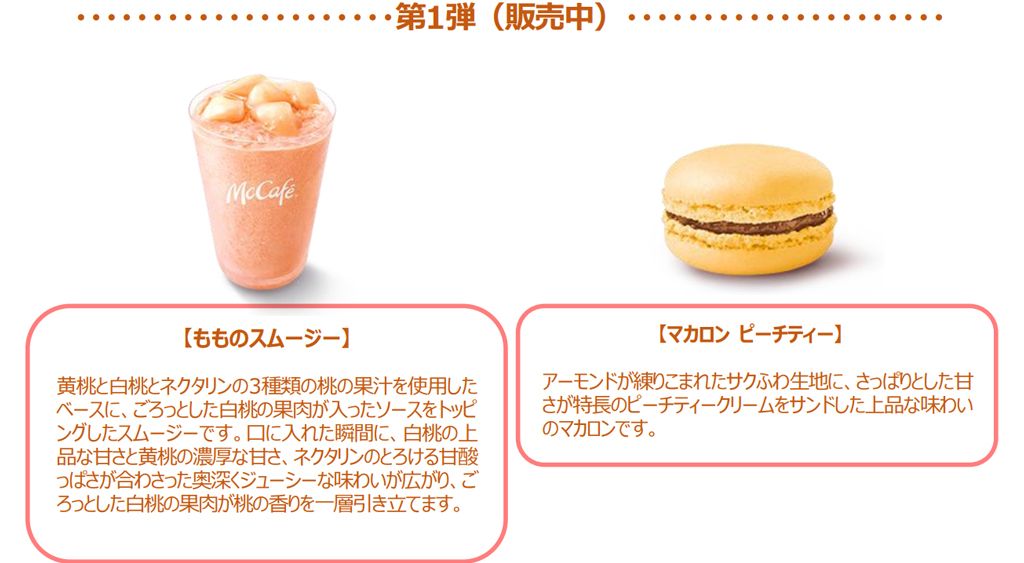 好評販売中の「もものスムージー」は、黄桃と白桃とネクタリンの3種類の桃の果汁を使用したベースに、ごろっとした白桃の果肉が入ったソースをトッピングしたスムージーです。また、さっぱりとした甘さが特長のピーチティークリームをサンドしたピーチティーが香る「マカロン ピーチティー」もご用意しています。