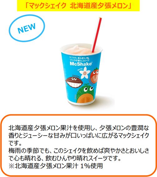 「マックシェイク 北海道産夕張メロン(北海道産夕張メロン果汁1%使用)」は、北海道産夕張メロン果汁を使用した、夕張メロンの豊潤な香りとジューシーな甘みが口いっぱいに広がります。梅雨の季節でもこのシェイクを一口飲めば、爽やかさとおいしさで心も晴れること間違いなしの飲むひんやり晴れスイーツです。
