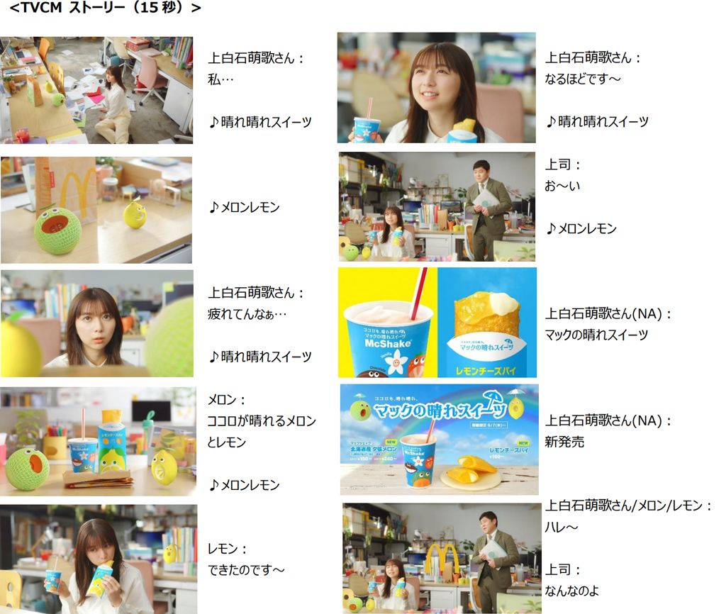 6月6日(火)より放映するTVCMには、女優の上白石萌歌さんを初めて起用しました。お疲れモードの上白石萌歌さんが、「マックシェイク 北海道産夕張メロン」と「レモンチーズパイ」を食べて晴れやかな面持ちになる様子を描いています。さらにTwitterキャンペーンを5月30日(火)より実施いたしますので、あわせてお楽しみください(詳細は下記を参照)。