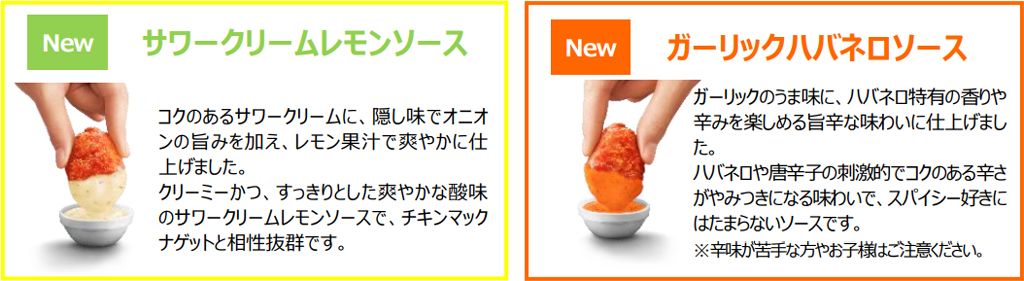 「スパイシーチキンマックナゲット」は、毎回その辛さをさらにお楽しみいただけるよう、期間限定ソースとともに登場しており、今回は新たに2種のソースが登場します。「サワークリームレモンソース」は、コクのあるサワークリームに隠し味でオニオンの旨みを加え、レモン果汁で爽やかに仕上げています。クリーミーかつすっきりとした爽やかな酸味が楽しめるソースです。「ガーリックハバネロソース」は、ガーリックの旨みとハバネロや唐辛子の香りや辛みを楽しめる、刺激的でコクのある辛さがやみつきになるスパイシー好きにはたまらないソースです。どちらのソースも「スパイシーチキンマックナゲット」はもちろん、レギュラーメニューの「チキンマックナゲット®」とも相性抜群です。