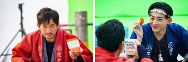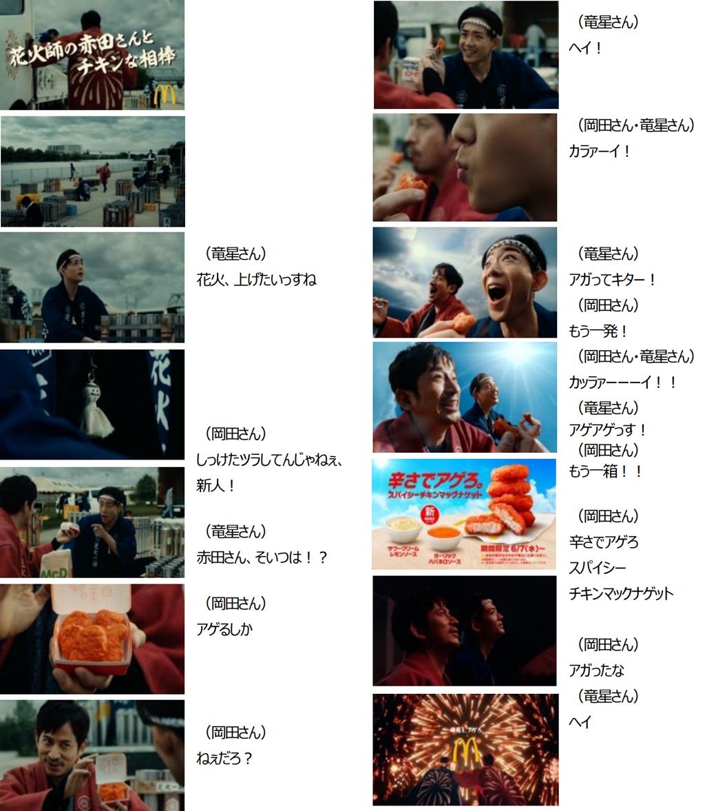 6月6日(火)からオンエアする新TVCMでは、今年1月に「スパイシーチキンマックナゲット 黒胡椒ガーリック」のTVCMにも出演した俳優の岡田准一さんと竜星涼さんが、今度は花火師として登場。「ニッポンの梅雨を、アゲろ」をテーマに、梅雨のどんよりと落ち込んだ気持ちを「スパイシーチキンマックナゲット」の爽快な辛さで吹き飛ばしてしまうことをユーモアたっぷりに描きました。お二人のコミカルな表情にもご注目ください。