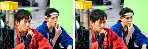 スタジオに登場してから撮影が始まるまで、ほとんど言葉を交わさなかった岡田さんと竜星さんですが、1カット目のOKが出ると岡田さんから歩み寄り「元気してた?」とニッコリ。竜星さんも再会を喜ぶように「してました!」と満面の笑みで返し、岡田さんの赤い法被姿を「似合いますね~!」と絶賛。岡田さんは「そう?」と照れくさそうな笑顔を見せていました。