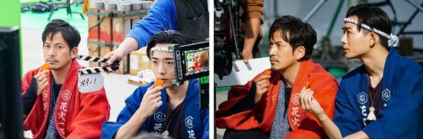 花火の道具がズラリと並びリアルに再現された打ち上げのセット。道具は実際に使用される本物が用意され、中には5号玉(隅田川の花火大会で最も大きい直径15センチの花火)やさらに大きな7号玉を打ち上げる筒も。花火師の指導を受け緊張した表情で作業に臨む竜星さんと朗らかな先輩を演じる岡田さんのコントラストが周囲の笑いを誘っていました。