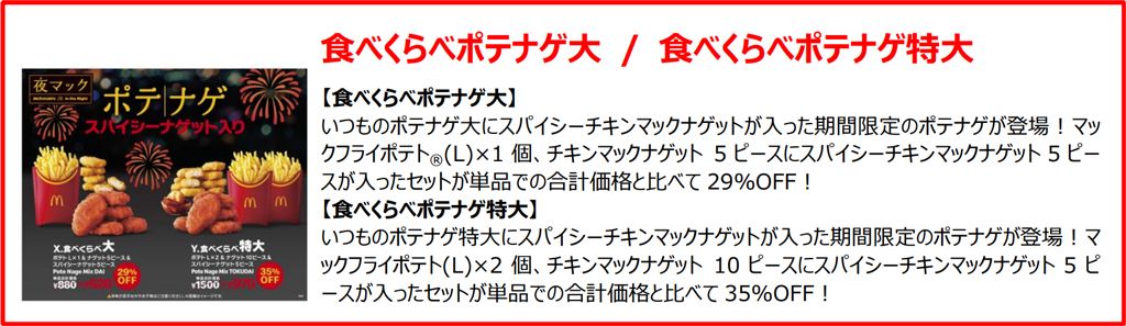 さらに、今しかできないお得な食べくらべセットとして、夕方5時からの夜マック限定の人気商品「ポテナゲ」に「スパイシーチキンマックナゲット」が入った「食べくらべポテナゲ大」と「食べくらべポテナゲ特大」が6月7日(水)から期間限定で登場いたします。