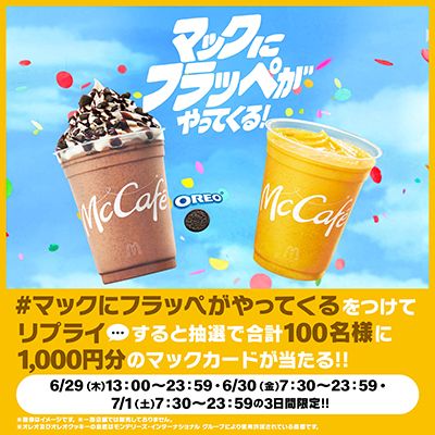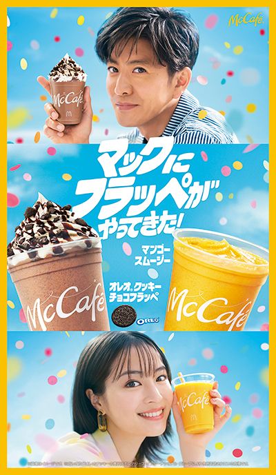 日本マクドナルド株式会社(本社:東京都新宿区、代表取締役社長兼CEO:日色 保)は、お客様においしく品質のよいカフェメニューをご提供するカフェブランド“McCafé®(マックカフェ®)”で、より多くのお客様にマクドナルドらしい気軽で自由なカフェ体験をお届けするため、「本気カフェ宣言」をかかげ、「プレミアムローストコーヒー」のリニューアルなど進化してまいりました。この度、“本気カフェ宣言”の第三弾として、マクドナルド併設型のカフェコーナー“McCafé by Barista®(マックカフェ バイ バリスタ)”(7月5日(水)時点で258店舗)限定メニューとして販売しておりました人気のレギュラー商品「オレオ クッキー チョコフラッペ」と「マンゴースムージー」、さらにフランス産「マカロン」3種を、全国約7割にあたる2,000店舗以上※1のマクドナルドでも提供を開始し、今後もフラッぺ&スムージーの提供店舗を順次拡大いたします。また、木村拓哉さんと広瀬すずさんを初めて同時起用した新TVCM『マックカフェ「マックにフラッペがやってきた」篇』を、7月4日(火)から放映いたします。