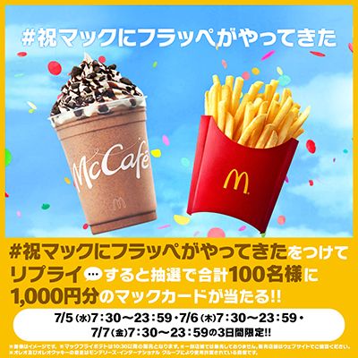 7月4日(火)から放映する新TVCMでは、McCaféのアンバサダーとしてTVCMにご出演いただいている、木村拓哉さんと広瀬すずさんのお二人がマクドナルドのTVCMで初共演。「マックにフラッペがやってきた!」をテーマに、マクドナルドにフラッペがあることに驚く木村さんと、木村さんより先に楽しんでしまう広瀬さんとのユニークな“心の会話”にご注目ください。また、Twitterキャンペーン等もご用意しておりますので、あわせてお楽しみください。(詳細は下記に掲載しています)