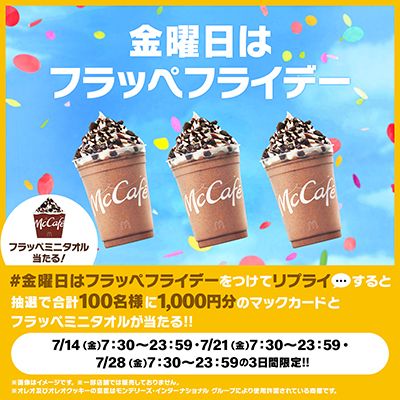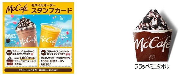 7月5日(水)~10月3日(火)の期間に、マクドナルド公式アプリからスタンプカードにエントリーし、モバイルオーダーでフラッペまたはスムージーを購入していただくと、購入1点ごとにスタンプが1つたまります。スタンプを1つためると抽選で当たるフラッペミニタオルの応募券が付与され、スタンプを2つためると「オレオ® クッキー チョコフラッペ」100円引きクーポンがもれなくもらえます。