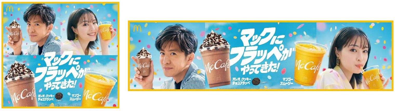 7月1日(土)より随時、札幌・仙台・東京・名古屋・大阪・広島・福岡の7都市にて木村拓哉さん・広瀬すずさんがフラッペ・スムージーを持っているビジュアルとともに「マックにフラッペがやってきた!」のメッセージをお伝えする屋外広告を展開いたします。お近くにお立ち寄りの際は、ぜひ屋外広告にもご注目ください。