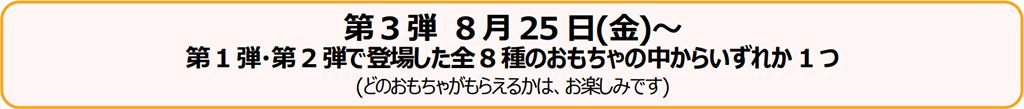 ※各おもちゃは、数量に限りがございますので、なくなり次第終了いたします。※どのおもちゃがもらえるかは、お楽しみです。