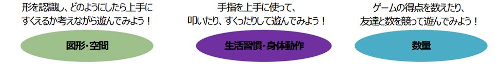 釣り竿でヨーヨーを釣りあげたり、水鉄砲でまとを倒したりするゲームは、図形や空間などの認識を高め、さらに、叩く、釣り上げる、すくうなど、手指を繊細に動かす身体動作を身に付けることができます。また、輪投げやピンボールなどの得点を競うゲームは、数の大小(数量)を考える遊びです。家族や友達と一緒に、得点を競い合ったり、手指の器用さを見せ合ったりして、ピカチュウたちとお祭りに出かけた気分で楽しく遊べます。