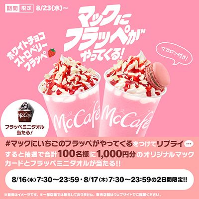 日本マクドナルド株式会社(本社:東京都新宿区、代表取締役社長兼CEO:日色 保)は、お客様においしく品質のよいカフェメニューをご提供するカフェブランド“McCafé®(マックカフェ®)”で、より多くのお客様にマクドナルドらしい気軽で自由なカフェ体験をお届けするため、「本気カフェ宣言」をかかげ、「プレミアムローストコーヒー」のリニューアルなど進化してまいりました。7月5日(水)に全国2,000店舗以上※1のマクドナルドでの「オレオ® クッキー チョコフラッペ」と「マンゴースムージー」、フランス産「マカロン」3種の提供を開始しましたが、このたび、期間限定のフラッペとして8月23日(水)より「ホワイトチョコストロベリーフラッペ」が登場します。さらに、木村拓哉さんと広瀬すずさん共演の新TVCM『マックカフェ「マックにいちごのフラッペがやってきた」篇』を、8月22日(火)から放映いたします。