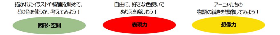 ぬりえは、描かれた線を手掛かりにして、色彩のデザインを考え、目と手を協調させて作業を楽しむ遊びです。「SPY×FAMILY」の物語を頭に思い浮かべて、キャラクターの性格やエピソードについて、お話ししてみましょう。登場人物や背景を、色で塗り分けてゆくことは、想像した世界を、カラフルに立体的に表現する力を育みます。微妙な中間色を、何色かの色鉛筆を塗り重ねて創り出したり、曲面のふくらみを陰影で表したりするなど、ぬりえには、子どもの遊びにとどまらない、深みのあるワザがあります。おうちの方もご一緒にお楽しみください。