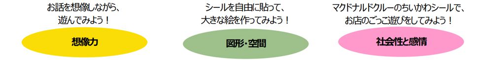子どもが最初に描く人物像は、大きな顔に手と足がついた「頭足人」です。「おたまじゃくし画」とも呼ばれます。「ちいかわ」のキャラクター達は、子どもにとってなじみ深い「頭足人」にも似て、顔全体に気持ちがあふれ、喜びや、照れや、驚きの感情を見せてくれます。「ちいかわ」のシールは、子どもはもちろん大人にとっても、「気持ちを伝える信号」になるのです。吹き出しにセリフを入れて、シールを自由に並べてゆけば、物語を想像する遊びが広がるでしょう。クルーのお仕事のシールも話題にして、「マクドナルドごっこ遊び」も楽しみましょう。