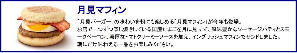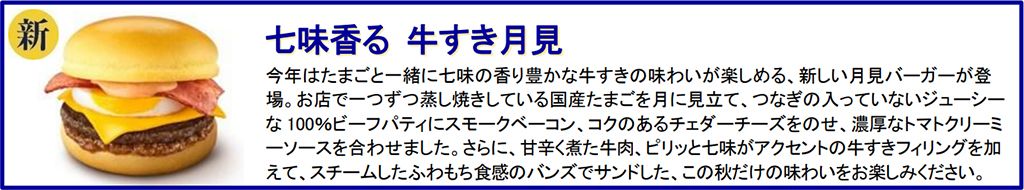 月を愛でる秋の風習“お月見”をイメージして1991年に誕生した「月見バーガー」は季節を感じられる期間限定商品として毎年秋にご提供している人気商品で、国産たまごとジューシーなビーフパティ、スモークベーコンに濃厚なトマトクリーミーソースを組み合わせた絶妙な一品です。新しく登場する「七味香る 牛すき月見」は、「月見バーガー」に甘辛く煮た牛肉と、ピリッと七味の香る牛すきフィリングを加え、ふわもち食感のバンズでサンドしました。定番の「チーズ月見」や朝マック®の「月見マフィン」も販売し、朝から夜まで1日を通してお楽しみいただける充実のラインアップとなっています。