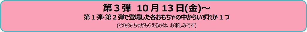 ※各おもちゃは、数量に限りがございますので、なくなり次第終了いたします。※どのおもちゃがもらえるかは、お楽しみです。