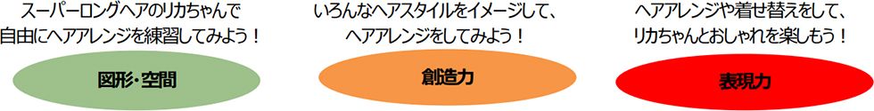 今回のハッピーセット「リカちゃん」は、スーパーロングヘアを自由にアレンジすることで図形や空間などの認識を深め、おしゃれにヘアスタイルをデザインする創造力を育む遊びができます。ロングドレスにプリンセスラインのクリアドレスを重ねて可愛くコーディネートしたり、ドレスの色の組み合わせを変えたりすることで、ファッションの表現力を伸ばします。リカちゃんと一緒に、おしゃれを楽しむワクワク感を育みましょう。