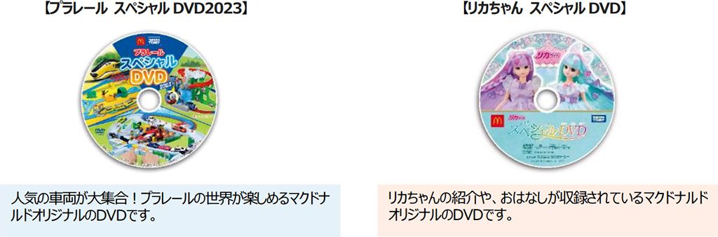 9月16日(土)・17日(日)・18日(月・祝)の3日間は、ハッピーセット「プラレール」を1セットご購入につき「プラレール スペシャルDVD2023」を、ハッピーセット「リカちゃん」を1セットご購入につき「リカちゃん スペシャルDVD」をプレゼントいたします。