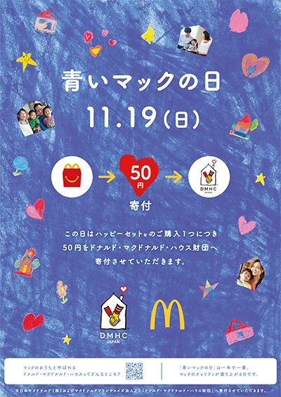 「マックハッピーデー“青いマックの日”」は、全国のマクドナルドでハッピーセットのご購入1つにつき50円を、マクドナルド*2からハウスを運営する公益財団法人ドナルド・マクドナルド・ハウス・チャリティーズ・ジャパン(以下、DMHC)に寄付させていただくチャリティ活動です。