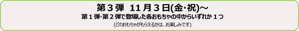 ※各おもちゃは、数量に限りがございますので、なくなり次第終了いたします。※どのおもちゃがもらえるかは、お楽しみです。