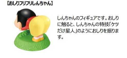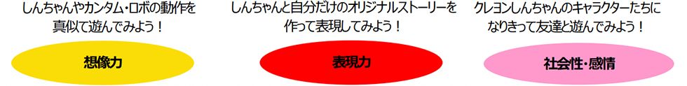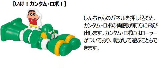 人気アニメ「クレヨンしんちゃん」がハッピーセットに初登場です。ハッピーセット「クレヨンしんちゃん」は、しんちゃんと一緒にお風呂などでも遊べる全6種類のラインアップです。第1弾は、しんちゃんらしい動きが特徴のおもちゃ「おしりフリフリしんちゃん」や、アニメでおなじみの「カンタム・ロボ」が登場します。第2弾は、ブクブク泡がでる「おふろでブクブクしんちゃん」など、お風呂で遊べるおもちゃです。「クレヨンしんちゃん」のストーリーを思い浮かべながら、しんちゃんの表情やカンタム・ロボの動作の真似をする、想像力を使う遊びが楽しめます。また家族と一緒におもちゃで遊びながら、しんちゃんの物語について話し合ったり(表現力)、いろいろな役を演じたりして遊ぶことで、社会性と感情を楽しく育むことができます。