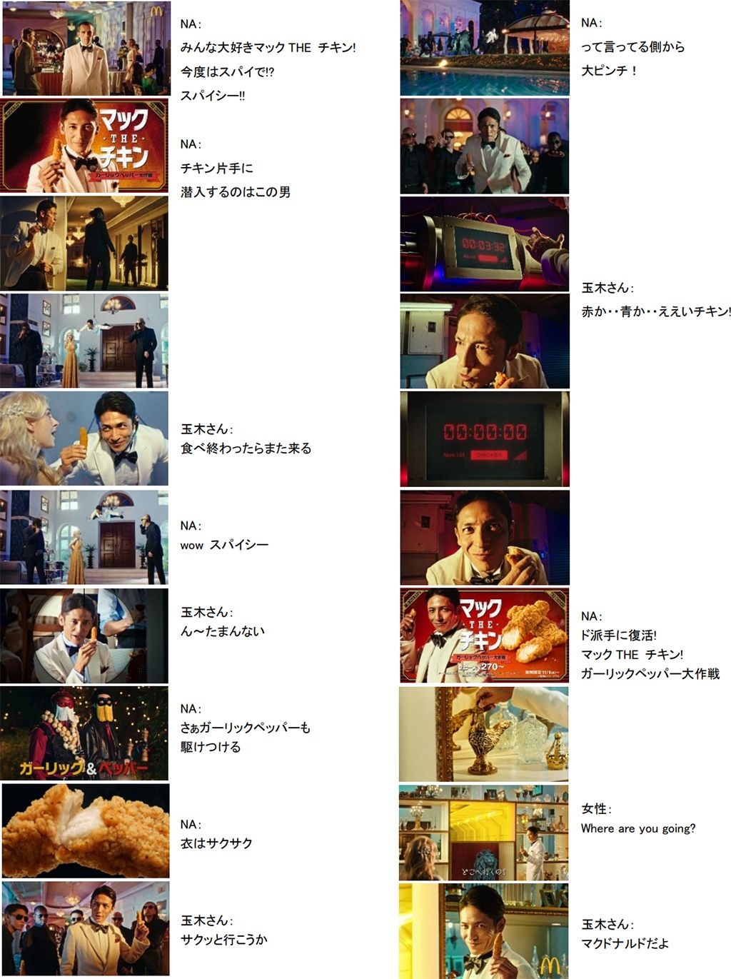 商品の販売にあわせて、玉木宏さんが“スパイ”になって登場する新TVCM「マックTHEチキン ガーリックペッパー大作戦」篇を、10月31日(火)から放映します。タキシード姿の玉木さんがチキンを片手に、スパイさながらのアクションやスリリングなシーンが映画を彷彿とさせるようなスケールの世界観と、コミカルなストーリーで、「マックTHEチキン ガーリックペッパー」がド派手に復活することを想起させる新CMにご注目ください。さらに、X(旧Twitter)キャンペーンなど各種施策もご用意しておりますので、あわせてお楽しみください(詳細は下記を参照)。